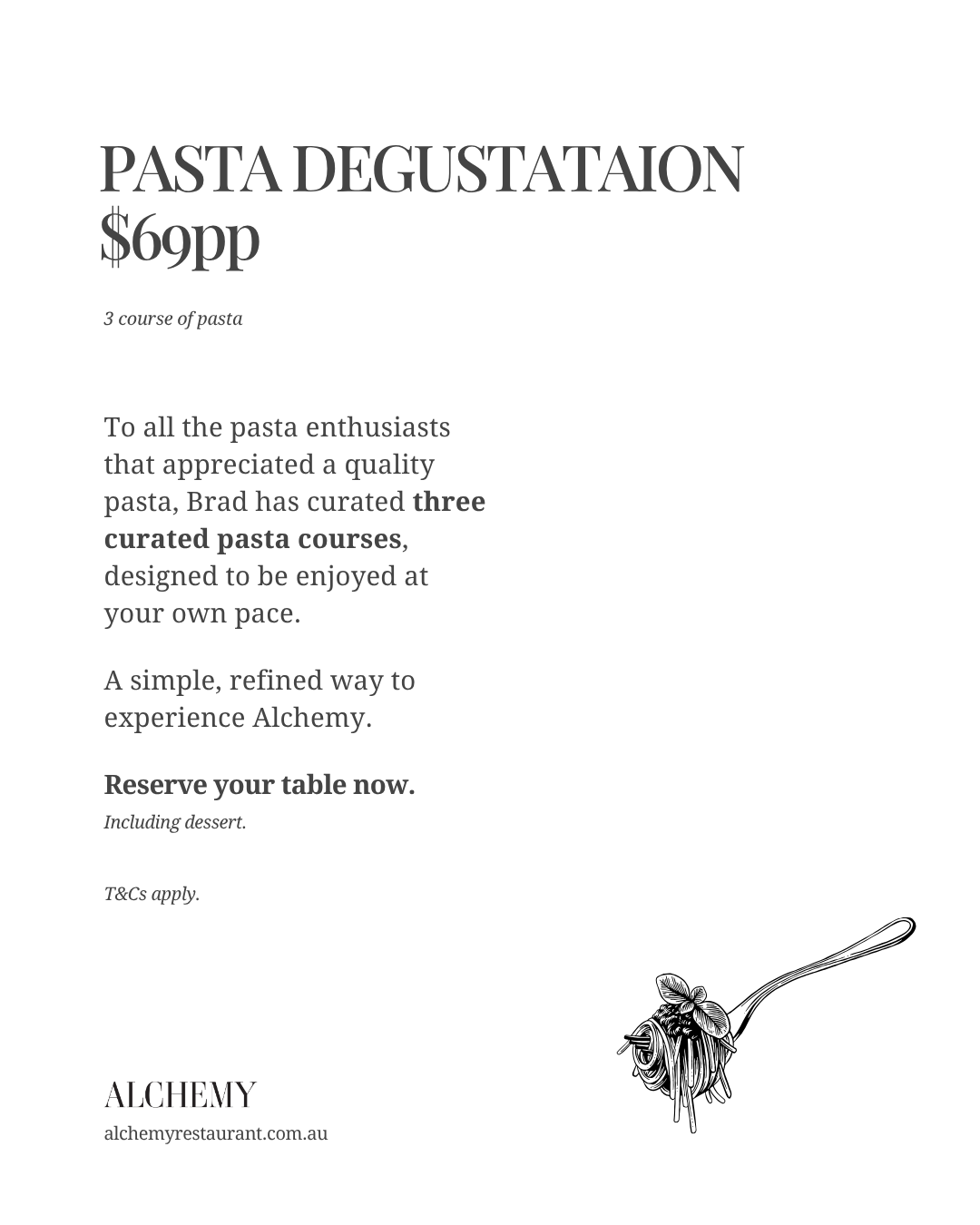 This April, settle in for an elegant evening of Italian-inspired dining with our Pasta Degustation at Alchemy.